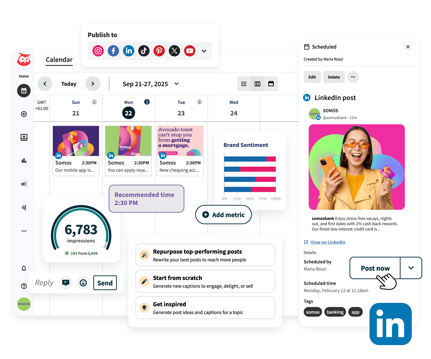 Create and manage LinkedIn ad campaigns right alongside your organic posts. Get more engagement and sales by building the most relevant targeted audiences and using AI to instantly generate ad variations.